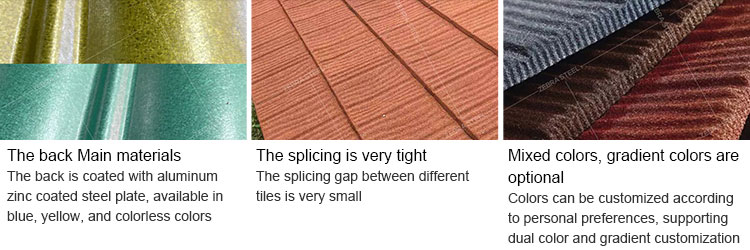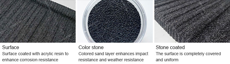 A:We use a unique primer formula with extremely strong adhesion, combined with a double-layer sandblasting process. First, we spray larger particles of vermiculite on the surface of the steel tile, and then spray smaller particles of colored sand on the gaps between larger particles, effectively keeping the colored sand from falling off for a long time.