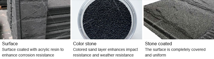 A:We use a unique primer formula with extremely strong adhesion, combined with a double-layer sandblasting process. First, we spray larger particles of vermiculite on the surface of the steel tile, and then spray smaller particles of colored sand on the gaps between larger particles, effectively keeping the colored sand from falling off for a long time.