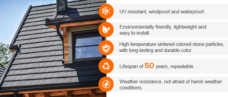 Environmental friendliness: The steel used for colored stone metal tiles can be recycled and reused