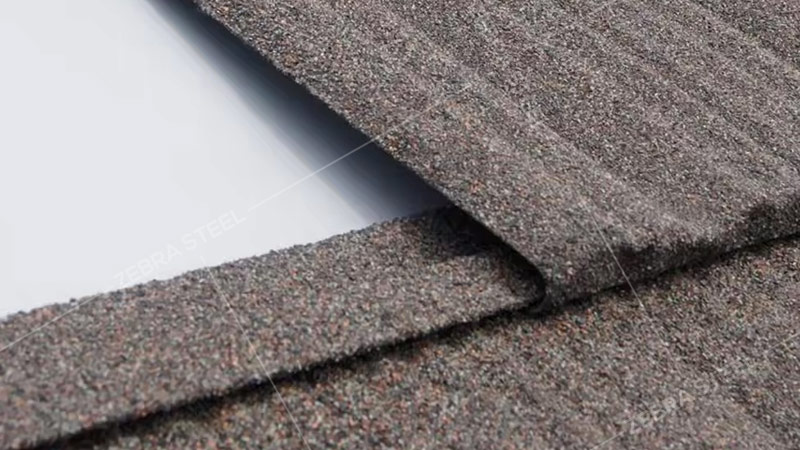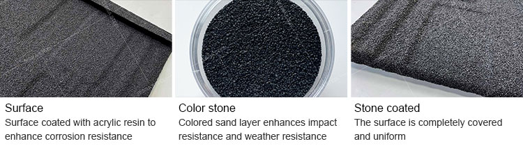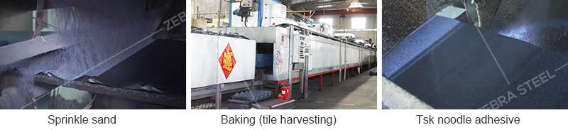 A:We use a unique primer formula with extremely strong adhesion, combined with a double-layer sandblasting process. First, we spray larger particles of vermiculite on the surface of the steel tile, and then spray smaller particles of colored sand on the gaps between larger particles, effectively keeping the colored sand from falling off for a long time.