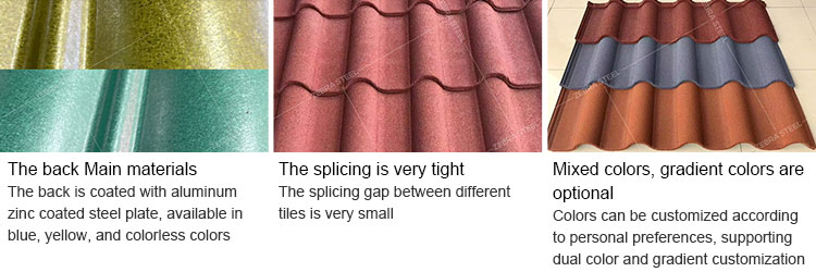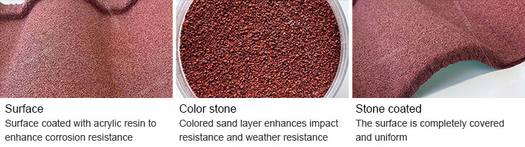 A:We use a unique primer formula with extremely strong adhesion, combined with a double-layer sandblasting process. First, we spray larger particles of vermiculite on the surface of the steel tile, and then spray smaller particles of colored sand on the gaps between larger particles, effectively keeping the colored sand from falling off for a long time.