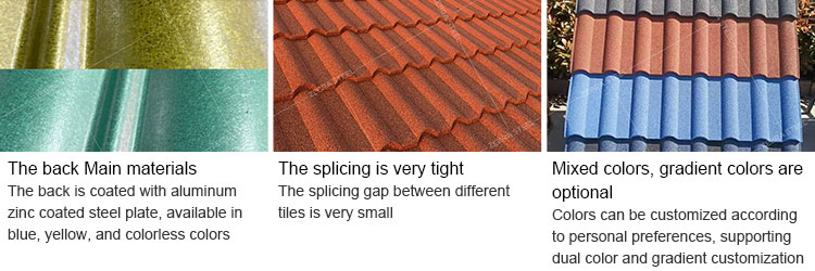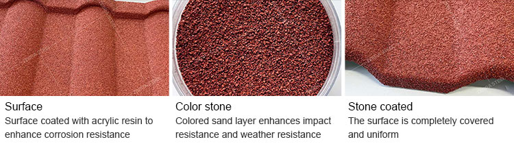 A:We use a unique primer formula with extremely strong adhesion, combined with a double-layer sandblasting process. First, we spray larger particles of vermiculite on the surface of the steel tile, and then spray smaller particles of colored sand on the gaps between larger particles, effectively keeping the colored sand from falling off for a long time.